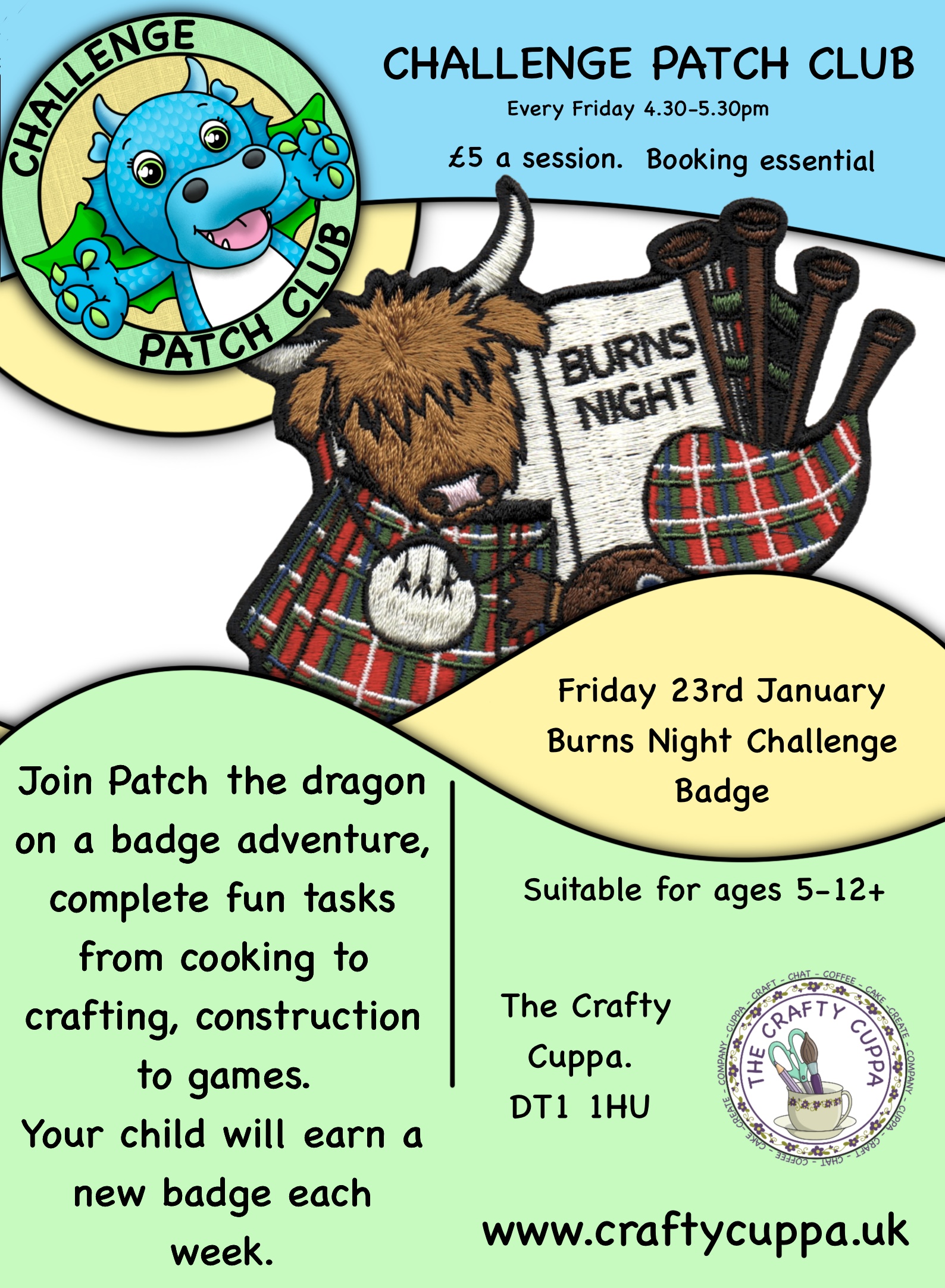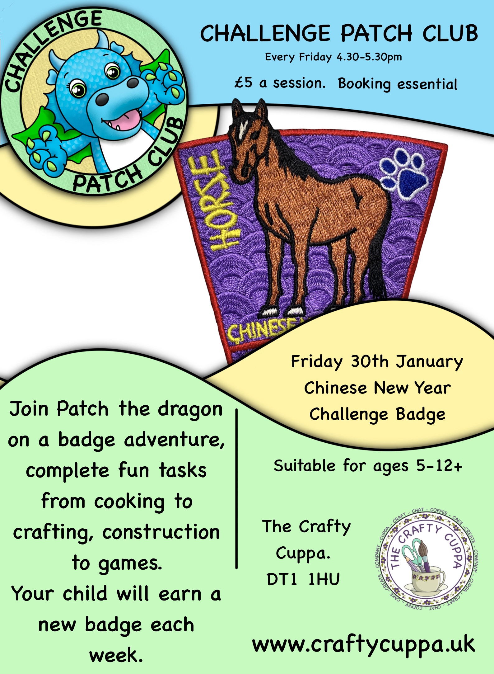 Crafty Cuppa 46 High East Street, Dorchester, Dorset, United KingdomJoin Patch the Dragon in the cafe workshop for our fun new club. Each week we will be completing a new challenge to earn a badge! All materials will be provided for your child to create up to 8 activities dependant on age to get a sew on badge. You can even purchase your very […]